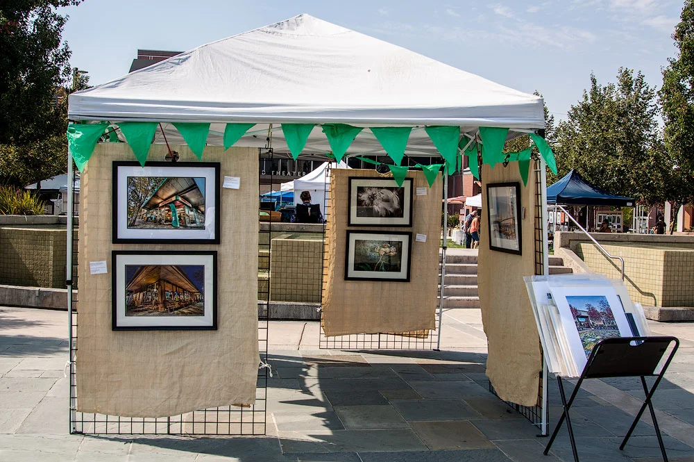 Jennie keeps booth layout as simple as possible with the majority of the booth consisting of covered gridwall and one 6 ft table to display small items and conduct sales from. Often times, there is a card spinner of greeting cards and a portfolio of larger packaged prints. Jennie introduces entry points into her display on as many sides as possible. She also likes to hang pictures on the outside of her tent, to provide a preview of what is under the canopy.