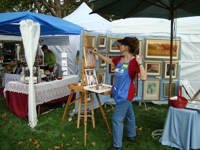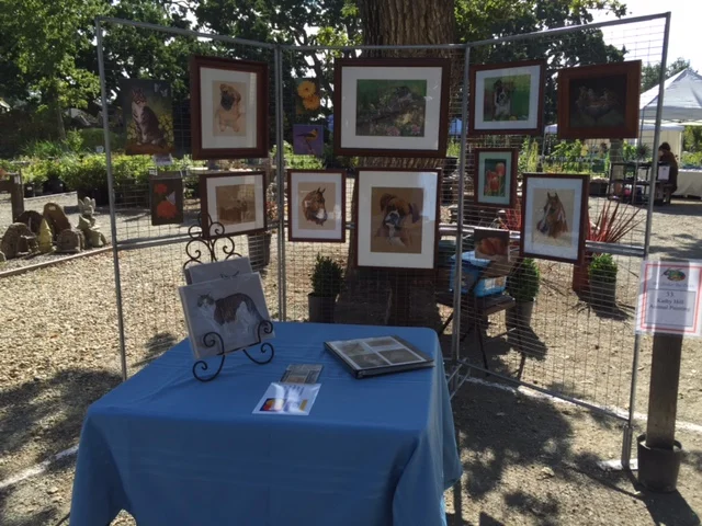 Well-known Tri-Valley artist and art show veteran Kathy Hill has over 25 years experience creating animal portraits. Although Kathy displays and sells her paintings at art festivals, they also allow her to opportunity to get commissions for portraits from pet lovers.