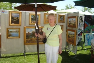 Kathy's show set up is minimal. She uses an umbrella as opposed to a canopy, uses a small table for business cards and a binder of pictures of her past work and a minimal number of racks, usually only using 3 racks. Kathy doesn't always use covers on her racks, but when she does, she uses covers she made from flat sheets. Kathy is also one of the few artists who demonstrates her painting while at the show.