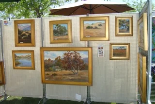 Generally, at art festivals, 2-d art is hung on racks. The Livermore Art Association (LAA) rents mesh style racks. These racks are approximately 3 ft x 6 ft, strong, hold up against wear and tear and are fairly light weight for their size but they are not very attractive. Another alternative is gridwall, which is better looking then the mesh racks and just as sturdy but heavy at over 20 pounds / panel. For more information on gridwall, visit the Grand+Benedicts site. An internet search can yield more information on alternate hanging systems and even provide information on how to make your own racks.