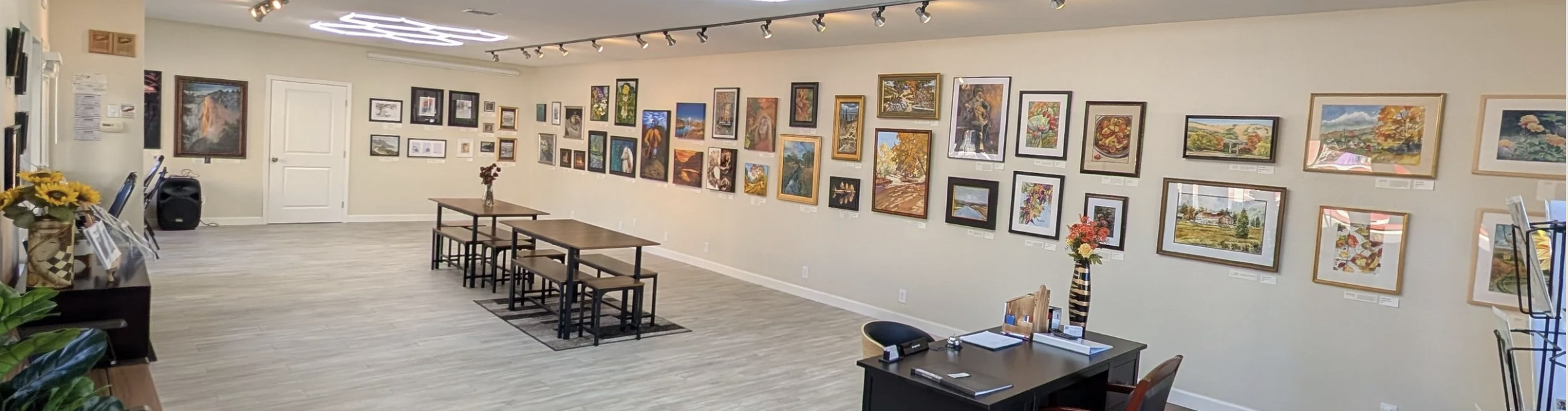 “We clear up all tables- put up panels against cubicles, and the space becomes a gallery. We can comfortably host about 30 artists, with 4-5 max pieces? Or more with fewer pieces. We do have tables, some easels- though for big pieces they are free to bring their own display easels. We can decide as the exhibit date comes closer. In our large space: we will have tag boards all along the walls, so very easy to display pieces on the wall. You are welcome to stop by anytime to check it out.